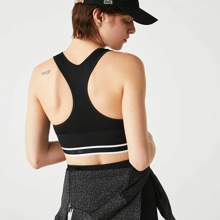If you’re looking for performance, fluidity and perfect comfort, look no further than this Lacoste SPORT bra. Crafted in recycled stretch interlock and equipped with a breathable mesh panel in the back, this quick dry piece features removable pads for a custom fit and flat stitching to avoid friction. A racerback and little tone-on-tone crocodiles complete this athletic basic.